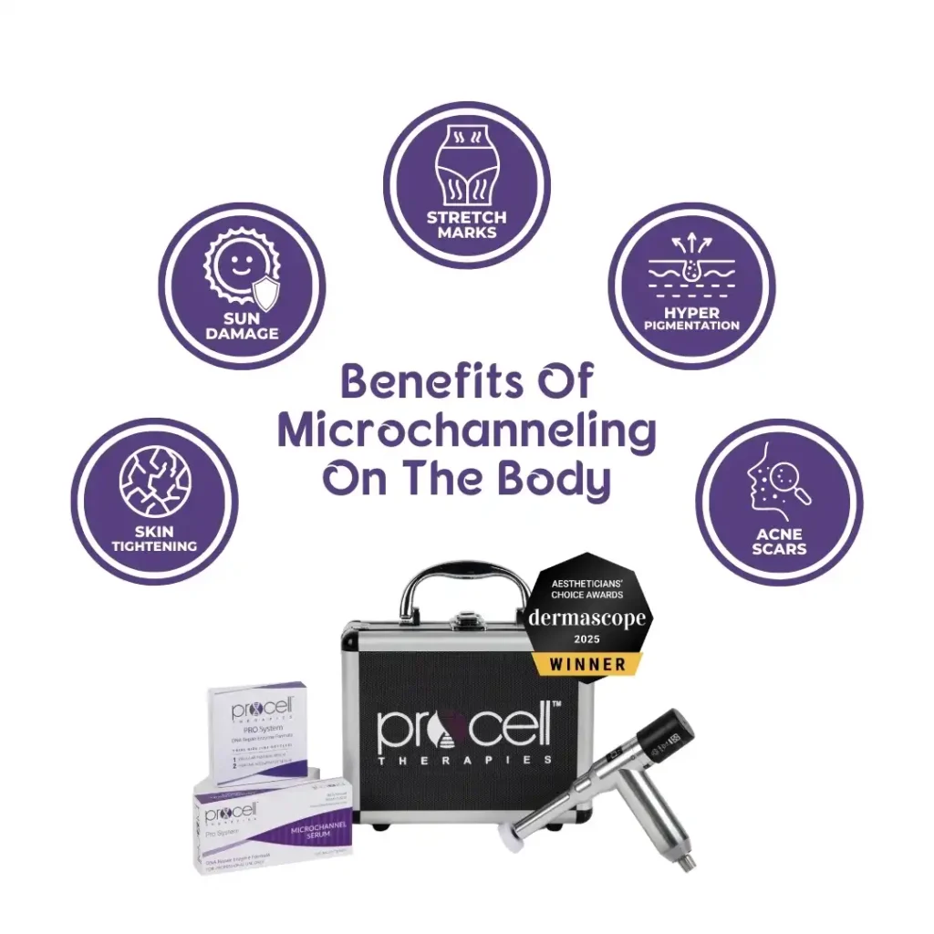 Procell has an extremely short downtime: 60-90 minutes while the microchannels in your skin close. Compared to the 3-5 day recovery period for traditional microneedling, Procell’s microchanneling treatment is the obvious choice for high quality results with minimal downtime.
